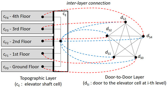 We have to consider an additional factor in computing the distance between different floors, called vertical distance. Vertical distance, for example through stairs, is not an isotropic measure with the horizontal distance due to different speeds, energy consumptions, transportation modalities, and so on. A rigorous survey on vertical distance is found at [32]. Figure 17 shows an example of the multi-layer configuration with topographic and door-to-door layers to compute vertical distance via the elevator. The topographic layer and door-to-door layer configurations are shown in the left part and the right part of the figure, respectively. Note that the red dotted lines represent the inter-layer connections between the cell at the i-th floor and the door connecting the i-th floor to the elevator shaft cell, while the blue dotted lines indicate the inter-layer connections between the door at the i-th floor and the elevator shaft cell. The topological relationships of all inter-layer connections in the figure are MEET in this case.