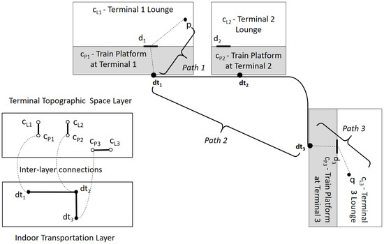 The transportation modality is an additional factor to consider in computing indoor distance. For example, when we compute an indoor distance between two points in different terminals of an airport, connected via the inter-terminal railway, we have to integrate multi-modal transportation that comprises horizontal movements, vertical movement via escalators and the inter-terminal railway. In this case, the traveling time is a more proper metric of indoor distance than the physical distance between two terminals. First, we provide an additional layer for indoor transportation, as well as the terminal topographic layer, as shown in Figure 18 in a similar way with door-to-door layer. Note that the weight of the edge in the indoor transportation layer graph is given as the traveling time between two nodes. In order to compute the traveling time from point p in the Terminal 1 lounge to q in the Terminal 3 lounge, we integrate the travel time of three paths, Path 1, Path 2 and Path 3 in Figure 18. The indoor distance is computed in a similar way given in the previous subsection by replacing the door-to-door layer graph with the indoor transportation layer graph and applying Algorithm 1.