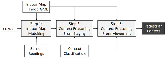 where p is a point collected from any indoor positioning device, c is a cell, I is a time interval, is a sequence of visit and is a context. , and are the functions for indoor map matching, context reasoning function from staying interval and context reasoning function from visit sequence, respectively. This process is summarized by Figure 19. In the subsequent sections, we will discuss each step.