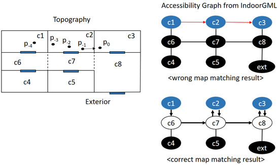 Note that this algorithm presents only the key idea at the conceptual level but not at the implementation level. First for Line 1 of the algorithm above, we can find the cell containing the current position of pedestrian by point-in-polygon or point-in-polyhedron algorithm with the cell geometry information given by IndoorGML. Second, we find the most probable cell by analyzing the indoor accessibility graph given in IndoorGML and the past trajectory. For example in Figure 20, is the current position and is the position at time where they are collected by an indoor positioning method. Then, the probability that the current cell is in is very low, since the indoor distance from to exceeds the maximum distance that a normal pedestrian could move within the time interval . The probability that the current cell is is higher than , and the most probable path is , depicted in white circles in the figure. In this paper, we do not discuss the implementation detail for Line 2, but several approaches such as the hidden Markov model may be able to estimate the probability of each route [37].