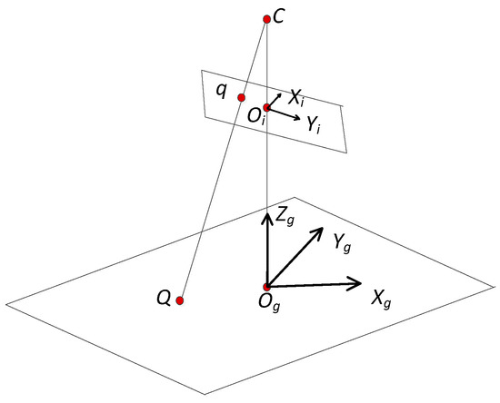 The geospatial video mapping equations are established using the homography matrix method. The relationship between the geospatial coordinate system and the image space coordinate system is shown in Figure 3. The center of the station is denoted by C, the image space coordinate system is denoted by Oi Xi Yi, and the geospatial coordinate system is denoted by Og Xg Yg Zg.