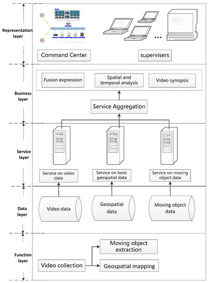 - Function layer: The function layer is a server with data processing and analysis functions. It is used for pre-processing GIS and video data. This layer has functional modules for video data acquisition, detection and tracking of moving object trajectories, and geospatial mapping of video data. The real-time video data processing, such as the extraction of moving objects and the spatialization of moving object trajectories, is executed in this layer. Thus, the function layer can provide the basic data support for real-time publishing.