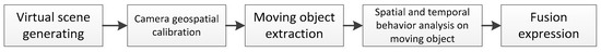 The server system adopts a plugin design, that is, it can load and unload plugins with different functions by using a unified access interface. The workflow of the system is shown in Figure 8. On the basis of the unified access interface of the system platform, plugins for virtual scene generation, moving object extraction, video spatialization, spatial–temporal analysis function, and virtual and real fusion representation are designed. The operation flow of the system is as follows: (1) virtual scene generation; (2) camera geospatial calibration; (3) moving object extraction; (4) spatial–temporal behavior analysis of moving object; (5) fusion representation.