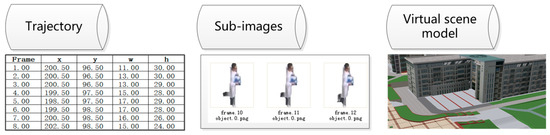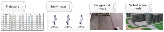 Data access form No. 1: Trajectory + Sub-images + Background images + 3D virtual scene model (Figure 9). This data access form corresponds to the foreground and background independent projection pattern. In this form, the video images are transformed into the trajectories and sub-images of the objects as well as background images. The sub-images are then used as the attribute data of the trajectories of the objects, and the background images are mapped to the virtual scene model as the attribute data of the camera.