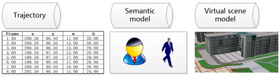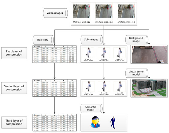 Third layer of compression: In this layer, the compressed data are oriented to the abstract of foreground projection pattern. The virtual avatar in semantic symbol is used instead of the sub-images of the moving foreground object to display dynamic video information in a virtual geographic scene. In the third layer of compression, spatial–temporal position is the only information that needs to be obtained from the original video.