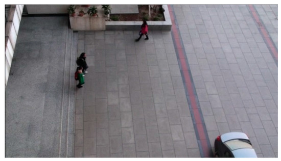 Compared with the original video image (Figure 14), the fusion representation between the 3D geographic scene and moving object may still be improved. The foreground projection pattern maps the video foreground to the geographic scene and loses the video background information in the visualization. The absence of the foreground projection pattern maps the predefined semantic symbols to the virtual scene effectively represents the information of the trajectory of the moving object. However, it loses the image texture information of the moving object in the visualization. Relevant image information needs to be reviewed in the original video for temporal positioning.