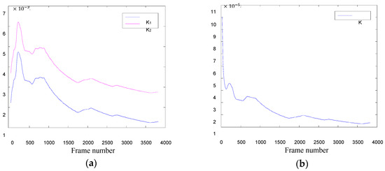Value of Kl changed with frame number. (a) l = 1 (solid line) and l = 2 (dotted line); (b) l = 3.