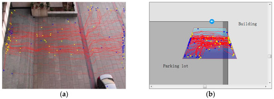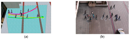 Trajectories of moving objects. (a) Trajectories represented in image space; (b) Trajectories represented in geographic space.