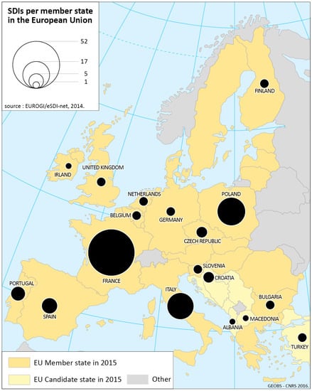 In Europe, the aim of the INSPIRE Directive (2007/2/CE) is to deploy a Spatial Data Infrastructure in the European Community by relying on the SDIs of member States. In France, the National Council for Geographic Information (CNIG) ensures co-ordination between the national infrastructure (which has been deployed by the National Geographic Institute (IGN) and the French Geological Survey (BRGM) since 2005) and the myriad of thematic (soil, water, coast, etc.) or infra-national (departmental, regional, cross-border, etc.) infrastructures established since that time. Compared to other members state in the European Union, France is unusual in its large number of SDIs (Figure 1).