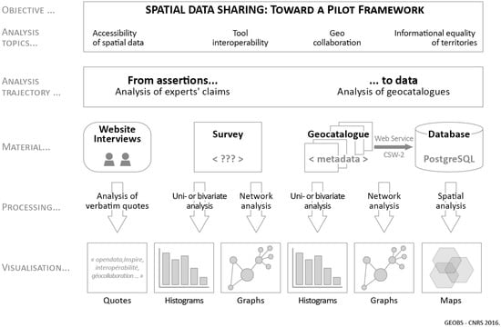 Our study proposes a methodological framework for critical analysis of spatial data infrastructures, intended to complement and support this field of research, thus contributing to the necessary “task of conceptualisation on the basis of empirical research” mentioned by Kitchin and Lauriault [15] (p. 14). A mixed method capable of capturing large, diversified datasets (metadata, website display, and results of the online survey and interviews) was applied to the French national and regional SDIs. The objective was to provide a comprehensive view of spatial data sharing, based on four dimensions. This necessitates a distinction between theory (what the promoters say) and practice (the reality for users) on data accessibility, the interoperability of information systems, actor networking, and informational equality of territories. Data accessibility was addressed by assessing the actual capacity of SDIs to provide access to reusable content by identifying properly-documented, downloadable data, suitable for use in a GIS. Interoperability of information systems concerned the capacity of SDIs to facilitate exchanges between expert systems and break down the silo approach of the 1990s (multiplication of isolated GISs for different specialities and regions with no interconnections). Actor networking was assessed by examining geocollaboration dynamics. Finally, we addressed the recurrent arguments justifying the implementation of these SDIs: equality of information in the territories. This implies that, unlike commercial systems, institutional platforms should provide homogeneous coverage of their area, in keeping with the principle of public service. This approach to the deconstruction of SDIs via the prisms of data, information systems, actors, and regions provides a critical analysis of the French context, comparing theoretical assertions with actual content. The reproducibility of this framework makes it possible to conduct analyses beyond the French context.