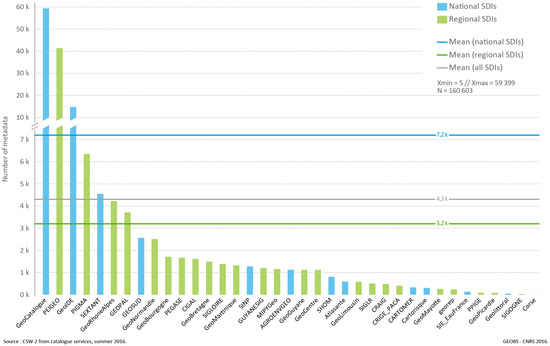SDI websites were analysed to determine the volume of spatial data documented in geocatalogues (Figure 3). In addition to the national geocatalogue, which includes 59,399 metadata sheets, or a little over one third of the material (160,603), the 37 other catalogues contained an average of 4300 metadata sheets: an average of 7200 in the national catalogues and 3200 in the regional ones.