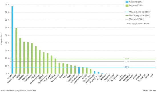 However, the vast majority of the documented data are not freely accessible. Thus, metadata searches including the key words “open data”, to identify freely-downloadable data, moderate the idea of a “data deluge” likely to drown users! Only 25 of the 37 geocatalogues with operational CSW offered free-access to data and, on average, only 15.7% of their catalogue data are currently downloadable (Figure 4). A gap between the national and regional levels may be noted, with more than twice as high a percentage (19.1%) of data tagged “open data” in regional compared to national catalogues (8.5%).