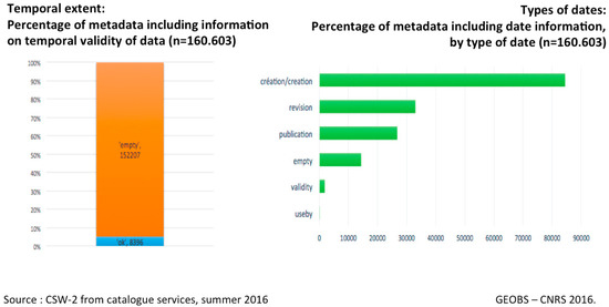 Our results show some limitations in comparing SDIs with one another in providing differentiated interpretations of the standards. Even though all SDIs refer to the INSPIRE directive and the ISO 19115 standard, geocatalogues are still being rationalised and standardised. We felt that obstacles to analysing metadata fields concerning data genealogy and dating were significant indicators of two major, related difficulties: the low quality of the metadata input and the complexity of current standards (with many subtleties, like date formats, which are not understood by data producers, whose core business is rarely geomatics). However, this observation does not prejudge the quality of the data to be analysed in terms of their specification (internal quality) and uses (external quality or “fitness for purpose”) [19]. This area of analysis is outside the scope of our study, which focused on a systematic exploration of metadata to visualise the contents of SDIs, without any distinction of quality.