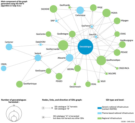 The graph in Figure 6 shows the network of interconnected regional and national SDIs, highlighting the central position of the Geocatalogue, which constitutes the national focal point for reporting under the European INSPIRE directive and is unusual in having connections to 21 SDIs—four times the general average. This graph also shows several specific circuits for accessing information:
