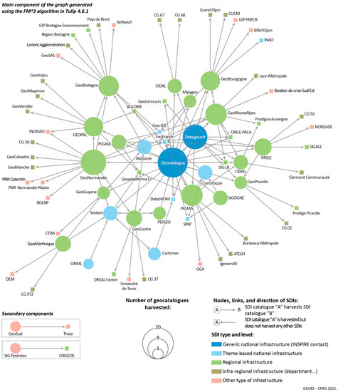 - Theme-based network components may also be highlighted, for example, by connecting SDIs on maritime or coastal themes and in French overseas regions (Sextant—GeoMartinique or PEIGEO link).