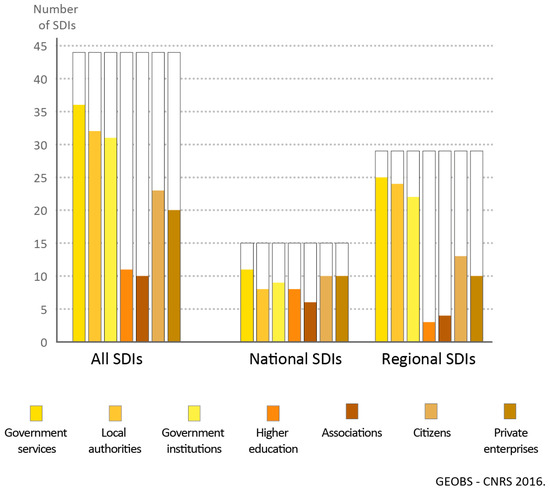 The gap between levels was also perceptible, with a more marked presence of local authorities in regional SDIs and the scientific community in national SDIs.