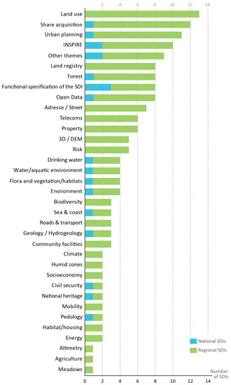 Approximately half of the SDIs in the study organised communities of practice [20] to promote data coherence and sharing. While each SDI ran an average of 5–6 specialities, major differences were noted between national platforms (one third of which coordinated a speciality) and regional platforms (two thirds coordinated a speciality). The 132 functional specialities coordinated by the 45 SDIs in the study covered a very wide range of themes, giving an overview of the main current concerns of GIS specialists (Figure 9).