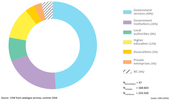 Analysis of metadata fields concerning “contacts” (of all types) revealed little diversity among SDI contributors (Figure 10): Over 216,600 organisations were identified in the 160,000 SDI metadata sheets studied (irrespective of their level) and 78% were public authorities (49% government services, 20% public bodies, and 9% local authorities). Teaching and research only represented 12% and associations and private businesses were in a very small minority (3%).