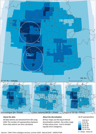 - Noucher, M.; Gourmelon, F.; Georis-Creuseveau, J. Toward an Observatory Prototype of the Contents of the 65 french SDIs. In Proceedings of the Inspire Conference—Geospatial World Forum, Lisbon, Portugal, 25–29 May 2015. [Google Scholar]