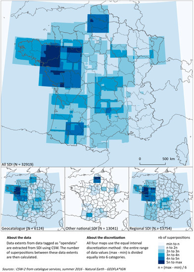 Finally, regarding informational equality of territories, this research gives a whole new spatial perspective on the issue of the public access to environmental information [28]. An analysis of the coverage of reference data in metadata catalogues is useful for reviewing the public authorities’ declarations on “egalitarian” treatment of the regions they administer. When many SDIs launched their platforms, they promoted the sharing of geographical frames of reference providing homogeneous coverage of their sphere of action. This logic is currently tending to be replaced by an approach aimed at aggregating the maximum amount of content, on a national, regional, or local level. Some striking contrasts have been revealed by this process, which may be indicative, not only of local issues, but also of power struggles around administrative or regulatory boundaries. The difference between catalogue data and open data was also important, as it revealed major contrasts according to the area covered and the scale of analysis.