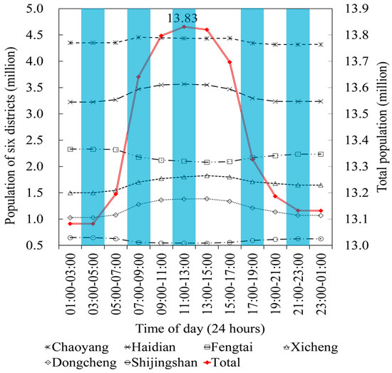 The hourly daytime and night-time population of all communities in the central area of Beijing can be calculated based on Equations (1)–(4). The night-time population, from 01:00 to 05:00, was provided by the community census data. Figure 2 presents the hourly changes of the total population of the six districts. The total population of the study area increased rapidly from 07:00. The peak total population of 13.83 million was reached at about noon; 0.7 million more people than the night-time population. The 0.7 million people entering from outside the region affected the overall density and population estimation with a low proportion of approximately 6% of the total population. The total population then decreased symmetrically until the evening, when the population was similar to the night-time population at 01:00 the next day. The shape of the curve and the daytime increase in population were consistent with the variations in the metropolitan population found by other researchers [11,12,16,58].