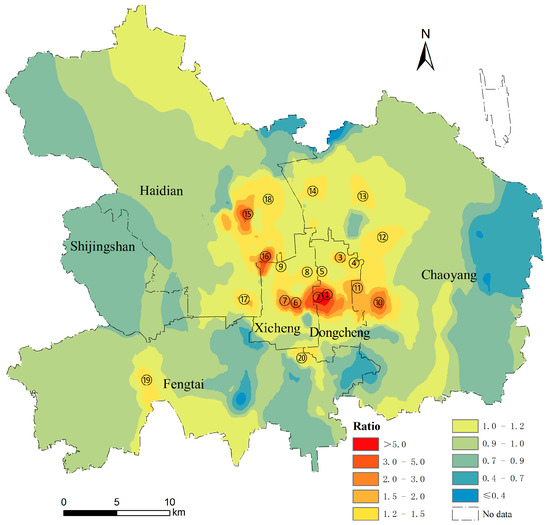 Spatial distribution of population ratio of day to night in the different districts of Beijing; see Table 3 for names of locations. The actual analysis units are communities; however, for a better representation, the distribution is smoothed by inverse distance-weighted interpolation.