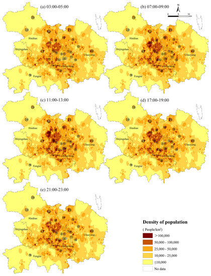 Understanding the variation in urban population during the daytime and night-time could help us better understand the mechanisms of city evolution [24]. Figure 4 shows the population density maps of the study area for five typical periods of 03:00–05:00 (night-time), 07:00–09:00 (morning peak), 11:00–13:00 (daytime maximum value), 17:00–19:00 (evening peak), and 21:00–23:00 (close to night-time) based on the hourly change of total population given in Figure 2. Overall, the distribution of population density in the six central districts showed a significant pattern of downtown-suburban-outer suburban, with a population density >25,000, 10,000–25,000, and <10,000 people/km2, respectively, from the center to the outer areas during both daytime and night-time. The daytime population spread significantly inward from the suburbs and outer suburbs to the downtown areas, especially from 07:00 to 09:00. In contrast, the urban crowds dispersed during the evening peak period as people returned to the residential areas. Table 4 suggests that the modes of the number of communities and area percentages of communities for different population densities in five time periods showed regular changes as positive feedback of the mobility of population. The number of communities and percentage of community areas increased around areas of population density >100,000 people/km2 and 50,000–100,000 people/km2 in the morning and decreased symmetrically in the afternoon. The modes of change in the rest areas showed opposite trends.