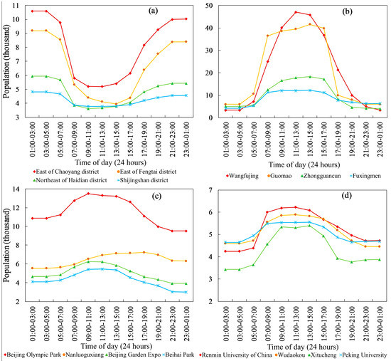 With the development of industrial and residential suburbanization in Chinese cities, the locations of urban population workplaces are now clearly different from the locations of residential areas [60]. Typical communities in residential, business, tourist, and university areas were selected to analyze the hourly changes of population (Figure 5). The four curves for the residential communities (Figure 5a) were obtained from Caofang station in Chaoyang, Fenzhongsi station in Fengtai, Yuxin station in Haidian, and Pingguoyuan station in Shijingshan. There are many universities within the catchment area of Wudaokou station, including the China University of Geosciences, the Beijing Language and Culture University, the Beijing Forestry University, and the China University of Mining and Technology. The University of Science and Technology Beijing is one of the universities within the catchment area of Xitucheng station. The population movements during daytime and night-time are summarized in the following sections.