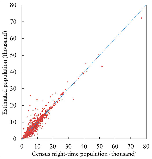 Error analysis indicated that the model performed well for night-time population at the community level. Figure 6 shows the counted census population versus the estimated night-time population from 21:00–23:00. During the night-time, the model accurately captured the population counts for the night-time residential population with a correlation coefficient of 0.92, and the median relative error for the communities was low at 4.4%. The estimated total night-time population was only 0.18% more than the population counted by the census data.