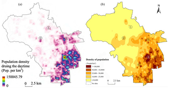 Figure 7a shows the statistical daytime population based on a relationship model from Qi et al. [24], and Figure 7b shows the estimated daytime population from 11:00–13:00 with the model developed in this study. There are very good spatial consistencies between the two maps, both for the spatial pattern with high values in the southeast and low values in the northwest, and for the nine high population density areas.