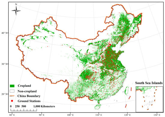 Since soil moisture is meaningful for sites at croplands in the research area, we removed non-cropland pixels such as water and urban areas. We used GlobeLand30 to exclude pixels with nine different land cover types differing from cropland.