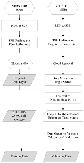 In addition to the GlobeLand30 2010 dataset, VIIRS SDR, in situ soil moisture measurements, precipitation ground observations, SMAP and GLDAS data were used in this study as follows.