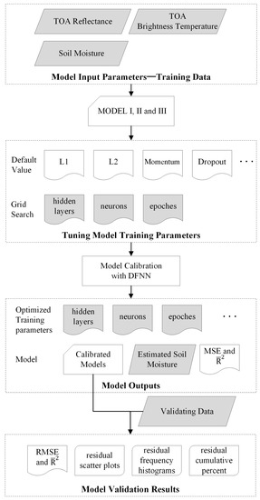 We built deep learning-based models including one input layer with two types of explanatory variables (VIIRS TOA reflectance and brightness temperature), one response variable (in situ soil moisture), one output layer (estimated soil moisture), and multiple hidden layers. The procedure of model building, as shown in Figure 3, includes the following steps.