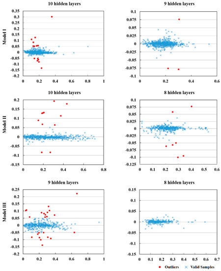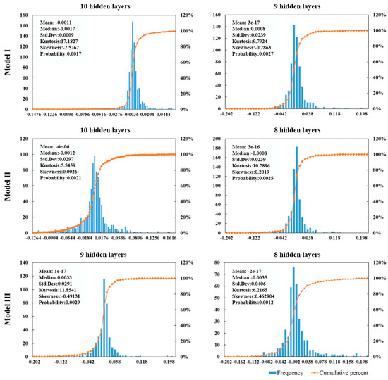 As shown in Figure 6, statistical significance of each model is less than 0.003, and the skewness is close to 0. This result demonstrates that the residual data of all models obeyed normal distribution. Specifically, for the optimal versions of Model I, the kurtosis of the model using 10 hidden layers is larger than that of the model using nine hidden layers, while the skewness of two models is opposite. The results indicated that the models with more hidden layers have greater statistical significance and more stable performance compared to those with less hidden layers for Model I. This conclusion was further confirmed by the probable outliers shown in Figure 5, and the number of probable outliers of the model using 10 hidden layers was greater than that of the model using nine hidden layers. The same conclusion can be drawn for the optimal versions of Model III. Conversely, for the optimal versions of Model II, the kurtosis of the model using eight hidden layers is larger than that of the model using 10 hidden layers, while the skewness of the two models is opposite to the kurtosis. One possible reason is that the large number of epochs (3500) could have resulted in overlearning problems and instability in the network’s generalization capability [40].