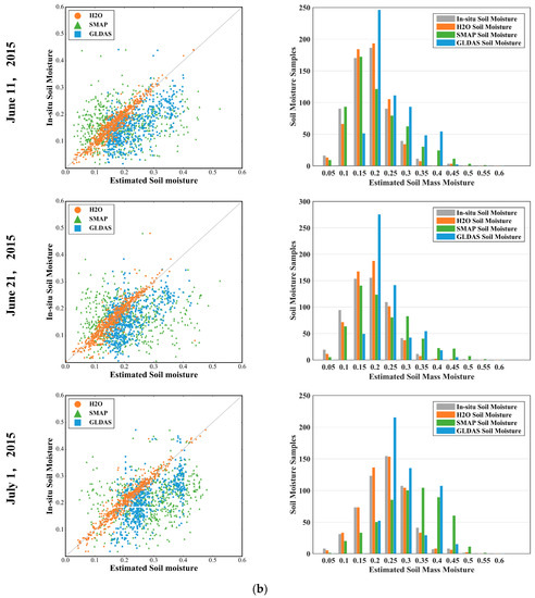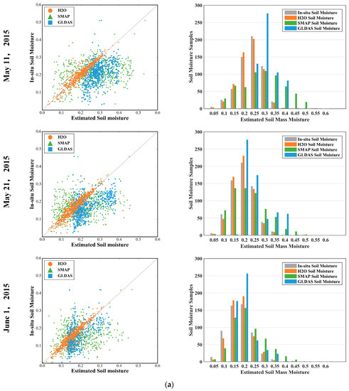 In Figure 7, where the panels on the left show the 1:1 scatter plots of three types of soil moisture estimates compared to in situ soil moisture measurements. The panels on the right are the corresponding distribution histograms of the soil samples on the six days. The H2O models performed better for soil moisture estimation than SMAP radar product and GLDAS product. The distribution pattern of their soil samples displayed the same trend. At the same time, the majority of the SMAP soil moisture values have a range of 0.15–0.25, indicating a systematic over-estimation problem compared to the in situ soil moisture measurements. One possible reason is that the measurement unit of the SMAP soil moisture is cm3/cm3 (water volume divided by water and soil volume), which differs from that of in situ soil moisture, i.e., g/g (water weight divided by water and soil weight). Theoretically, the volume water percentage is equal to the result of the gravimetric soil moisture multiplied by the density of water and soil. Strictly speaking, the density of the water and soil is greater than 1; as a result, the majority of the SMAP soil moisture results are greater than the in situ soil moisture measurements. For GLDAS, the points plot closer to the 1:1 line than those of the SMAP but farther than those of H2O, in accordance with the correlation results shown in Table 5.