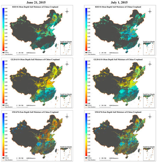 H2O model estimated soil moisture at 0–10 cm depth, SMAP radar estimated soil moisture at 0–5 cm depth and GLDAS estimated soil moisture at 0–10 cm depth maps for cropland in China on 21 June and 1 July 2015.