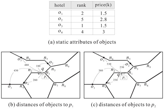 With the fast advance of positioning techniques in mobile systems and the popularization of portable computers (e.g., laptops, 3G mobile phones and tablet PCs), spatio-temporal databases that aim at efficiently managing a large number of moving objects so as to support various types of location-based queries have attracted much attention in the database community [1,2,3,4]. Many applications, such as geographical information systems, traffic control systems and location-aware advertisements, can benefit from efficient processing of the location-based queries. The distance-based skyline query is an important type of location-based query that can provide useful information for preference-based data analysis and has a wide range of real applications [5,6,7]. Given a set of data objects with m dimensional attributes and a query object q in a road network, the distance-based skyline query finds the objects in that are not dominated by any other object, in terms of the m attributes and the road distance to q. More specifically, object p dominates another object if (1) its value in each attribute is as good or better than that of and is better in at least one attribute and (2) it is closer to q than . The objects not dominated by others are termed the skyline objects.