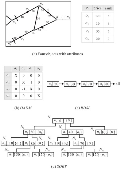 where “1” and “” mean that there is a dominance relationship between objects and , and “0” shows that and cannot dominate each other, in terms of their object attributes. Consider the example in Figure 2a, where four objects to are located on a road network, and have “price” and “rank” attributes. Assume that a continuous within skyline query is processed to find the skyline objects within the distance range . As the road distances between objects to and the node are less than or equal to 100, they all are kept in the OADM of . In terms of the “price” and “rank” attributes of objects, the value of each entry in the OADM can be determined by using Equation (1), as shown in Figure 2b. In this figure, only objects , and are the WSOs of node (because is dominated by ).