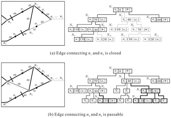 - For the time-varying edge length of an edge e: the process of updating the SOET of node n needs to first determine which objects are affected by e and then re-compute their road distances to n. For the case that the length of edge e connecting nodes and is changed from to ∞ (i.e., e is temporarily closed), the SOET of node n is traversed from its root down to leaf level so as to check whether there are parent-child relationships between the tree nodes containing and . If no such parent-child relationship exists, then the SOET of n remains valid because edge e connecting and falls out of the distance range d. Otherwise, the subtrees rooted at the tree nodes containing and are affected by e and need to be removed from the SOET. For the case that the length of edge e connecting nodes and is changed from ∞ to , some objects’ road distances can further decrease because e now is passable. As such, we perform a grown expansion starting from and to include the objects whose decreasing distances are less than or equal to d. Then, the subtree rooted at the tree node containing (or ) is updated accordingly to contain information of such objects. Here, we explain the two cases using a concrete example, continuing the previous example in Figure 2. Assume that the edge connecting nodes and is temporarily closed (corresponding to the first case), as shown in Figure 3a. Having traversed the SOET of node , we know that both the tree nodes and ( and ) contain node (). As there is a parent-child relationship between and ( and ), the subtree rooted at () is removed from the SOET (the shaded part in Figure 3a), so that the road distances of objects and are re-computed as ∞ (because is on e) and 120, respectively. As a result, objects and are removed from the OADM and the RDSL of . Going back to the example in Figure 2, assume that the edge connecting nodes and is passable, and its length is equal to 30 (corresponding to the second case), as shown in Figure 3b. Starting from the tree nodes and containing node , two new subtrees have been included into the SOET (the bold part in Figure 3b) because their updated distances do not exceed the distance 100.