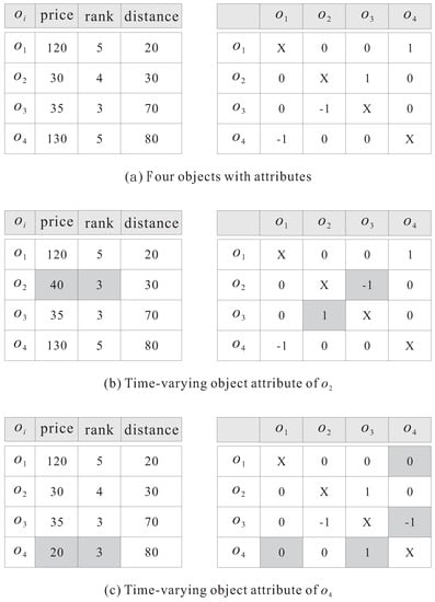 The first case where and implies that no object can dominate o and in terms of the object attributes and the “distance” attribute (closer to n than o and ). Let us observe the value of entry in the OADM affected by the time-varying object attribute, consisting of the following six conditions, to determine whether the needs to be updated.