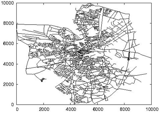 All experiments are performed on a PC with AMD Athlon X2 5200 CPU and 2 GB RAM. The algorithms are implemented in C++. As shown in Figure 5, the road map, Oldenburg (a city in Germany) [23], consisting of about 6000 nodes and 7000 edges, is used in our simulation. The set of data objects (varying from 10 K to 200 K) is generated using the generator proposed in [24], which is the most popular framework used in road networks [25,26,27]. Each data object has several attributes (ranging from two to six) whose values are normalized in the range . In the experimental space, we also generate 30 query paths, each of which consists of multiple edges (ranging from one to 16). For each query path , we perform a continuous within skyline query to find the WSOs for each point on , in which the distance d varies from to of the entire space. Based on the WSOs result obtained, the OADM, the RDSL and the SOET of each node belonging to are maintained for the within skyline object updating algorithm. To investigate the effect of the time-varying information on the performance of the proposed approaches, for each query path , we set the default number of updates to 20, and each update process involves of objects changing their attributes (where x varies from zero to 20), of edges updating their lengths (in which y varies from zero to 16), and of edges on affected by the time-varying query path (where z varies from zero to 25). The performance is measured by the average CPU time in performing workloads of 30 continuous within skyline queries with 20 updates. Table 2 summarizes the parameters under investigation, along with their default values and ranges.