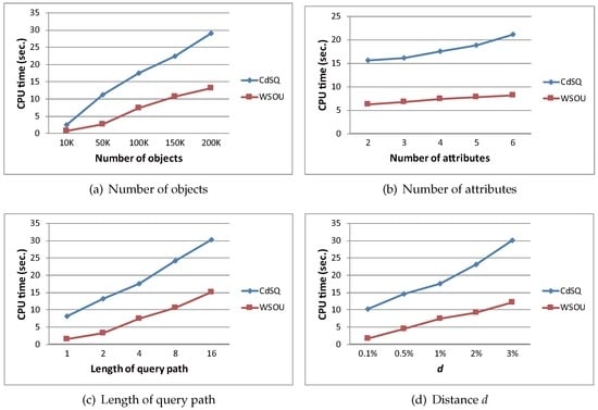 Finally, in Figure 6d, we compare the performance of the WSOU algorithm and the CdSQ algorithm with respect to different values of d (ranging from to ). For the WSOU algorithm, a greater d leads to more objects kept in the OADM, the RDSL and the SOET (i.e., more objects with the distance range d), and thus, the required CPU time increases slightly with the increasing d (but basically, the CPU time is still under 10 s). For the CdSQ algorithm, a smaller d is favorable because less computation of road distances of the objects within the distance range d has to be performed. However, when d increases to a larger value (e.g., ), meaning that more qualifying objects are considered, the CPU cost of the CdSQ algorithm becomes much higher than that of the WSOU algorithm (because it has no chance of avoiding the query re-execution).