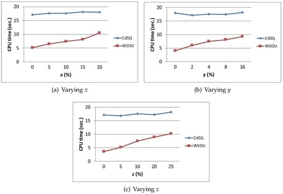 The last experiment shown in Figure 7c evaluates the effect of the time-varying query path on the CPU time of the WSOU algorithm and the CdSQ algorithm, in which ranges from to . A large value of z leads to more number of edges belonging to the query path and affected by the time-varying query path (that is, more edges belonging to , where is the updated query path). For the WSOU algorithm, the CPU cost increases with z, because more processing time is required for determining the WSOs of edges belonging to using the continuous within skyline query. Note that the WSOs of edges belonging to are still valid, for which the continuous within skyline query need not be executed. For the CdSQ algorithm, the CPU time is almost not affected by the value of z. The reason is that the continuous within skyline query has to be re-executed, regardless of whether the query path is changed or not. Again, the simulation shows that the WSOU algorithm performs better than the CdSQ algorithm in all cases.