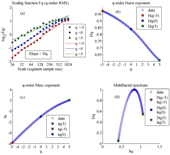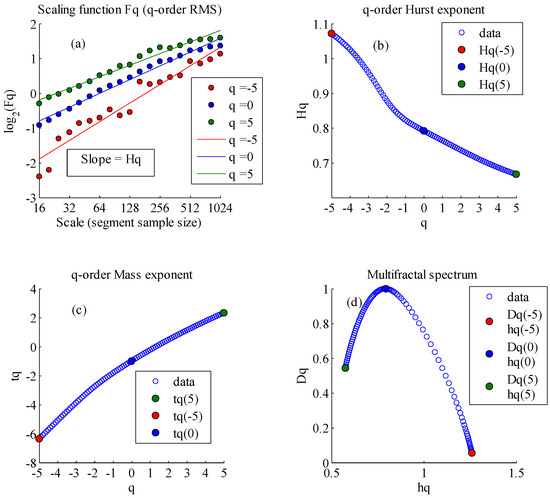 Step 6: Calculate the qth mass exponent tq, the qth singularity exponent hq and qth singularity dimension Dq. In Equation (7), tq is another measurement for scaling exponents and Hq is the Hurst index, and the relationship between these two parameters is as below,