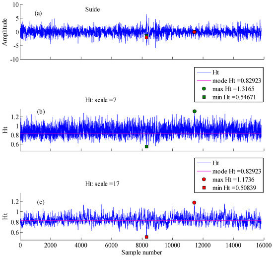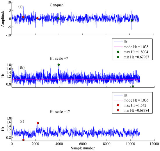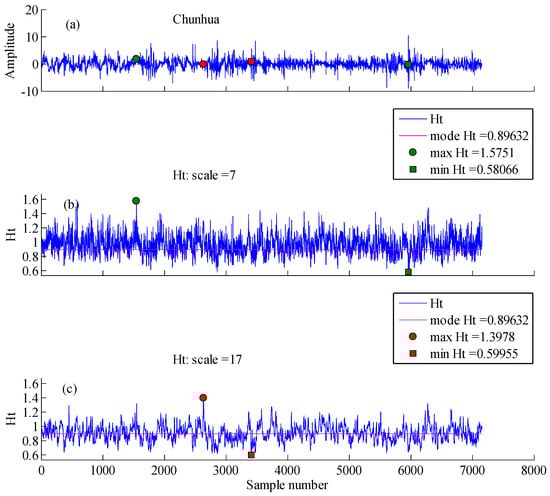 Figure 7a–c shows the result for the Chunhua site. In Figure 7b,c we can see that, when scale = 7, the maximum Ht is 1.5751 (Pn = 1500), the minimum is 0.5807 (Pn = 6000), and the mode value is 0.8963; and when scale = 17, the maximum Ht is 1.3978 (Pn = 2700), the minimum is 0.5996 (Pn = 3400), and the mode value is 0.8963. The local Hurst exponent is mostly greater than the mode, while the extreme point of Ht of both scales is similar in that it is totally different, this may be due to the strong effect of the scale on the analysis of the Chunhua site, which indicates that the land morphology features are distributed unevenly.