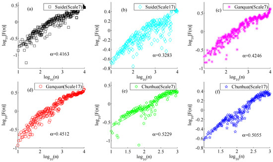 DCCA analysis of the local Hurst exponent of the topographic variation and loess shoulder-line elevation sample data at different scales. (a) The α of analysis scale 7 in Suide site; (b) the α of analysis scale 17 in Suide site; (c) the α of analysis scale 7 in Ganquan site; (d) the α of analysis scale 17 in Ganquan site; (e) the α of analysis scale 7 in Chunhua site; (f) the α of analysis scale 17 in Chunhua site.