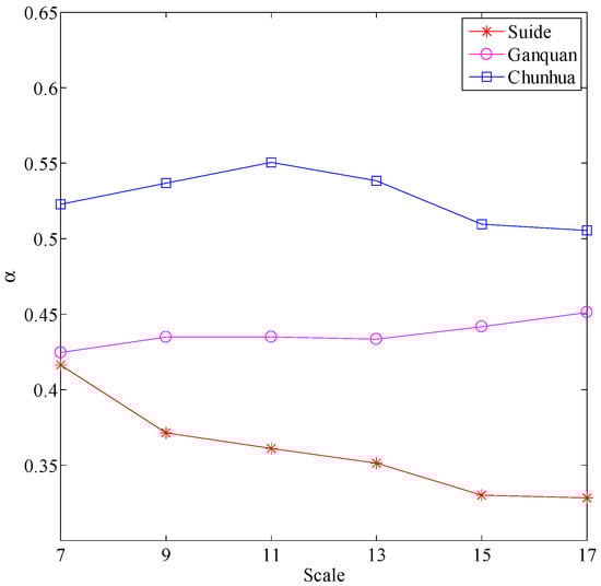 Figure 8a,b shows that the correlation coefficient α of the loess shoulder-line topography and local Hurst exponent of topographic variation of the Suide study site for the analysis of scale 7 and 17 are relatively small, i.e., 0.4163 and 0.3283, respectively. The DCCA parameter α decreases with increasing analysis scale, which indicates the analysis scale to loess shoulder-line topographic variation is not affected. In the different analysis scales, the DCCA correlation coefficient α of the Suide site is less than that of the Ganquan and Chunhua study sites. In all the analysis scales, the highest correlation coefficient is 0.4163, and the best analysis scale is 7 for the Suide study site. All of the DCCA correlation coefficients α are very low for the Suide site and this suggests that the local Hurst exponent is not reliable for representing the loess hill land surface variation. Figure 8c,d shows that the DCCA correlation coefficient α in the analysis scale 7 and 17 are 0.4246 and 0.4512, respectively, for the Ganquan study site. In this case, the DCCA parameter α increases when the analysis scale increases. This indicates the reliability of the local Hurst exponent that reflects the loess ridge land surface variation. For the Ganquan site, the optimal analysis scale is scale 17 when using the local Hurst exponent to describe the topographic variation. Figure 8e,f shows that the correlation coefficient α is more than 0.5 for the Chunhua site, at the analysis scale 7 and 17, the values of the correlation coefficient α are 0.5229 and 0.5055, respectively. The local Hurst exponent and loess shoulder-line land variation has a relatively strong correlation in the Chuanhua site and this indicates that the local Hurst exponent is very suitable to reflect the loess tableland topographic variation. According to Figure 9, at the different analysis scales, the DCCA correlation coefficient α is the highest for the Chunhua site, for which the correlation coefficient α is different from that of the other two sites. An increase in the analysis scale first increases and then decreases the correlation coefficient α, which reaches its maximum when the analysis scale is 11, which is the best analysis scale of the Chunhua site. In the loess shoulder-line land surface analysis of loess tableland, the selection of a suitable analysis scale has a great influence on the results of land surface analysis.