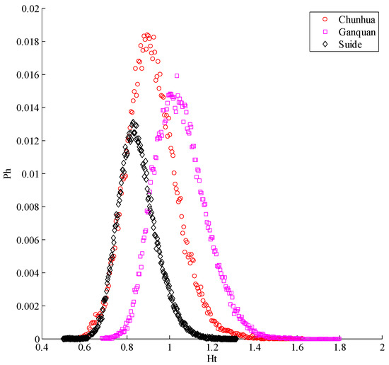 Figure 10 shows the Ph–Ht probability distribution for all study sites. As demonstrated in Figure 11, the plot of the local Hurst exponent conforms to an approximate normal distribution and the mean Ht increases in the order: Suide < Chunhua < Ganquan. This result indicates that the topographic variations are relatively smoother at the Ganquan site, and relatively steeper at the Suide site. As demonstrated in Figure 11, the standard deviation of Ht decreases in the order: Chunhua > Ganquan > Suide. This result also indicates that Ht is concentrated around the mean of the Suide site, Ht is scattered around the mean of the Ganquan site, and Ht is the most disperse around the mean of the Chunhua site.