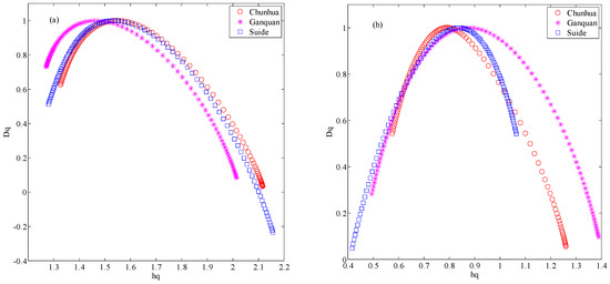 Figure 2d, Figure 3d and Figure 4d shows the Dq–hq relationship of the three sites according to Equation (12). All of the bell curves in Figure 2d, Figure 3d and Figure 4d indicate strong multi-fractal characteristics. The top of the multi-fractal spectrum of Ganquan in Figure 3d and Table 2 is relatively flat (the spectrum width is 0.8945), which shows that the elevation sampling data exhibit considerable fluctuation and non-uniform distribution. Contrary to this, the plots of Suide and Chunhua are relatively sharp (the spectrum widths are 0.6479 and 0.6852), which shows a gentle fluctuation and uniform distribution.