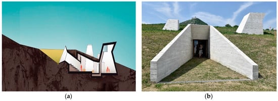 (a) Visualization of the underground construction of the archeological park in Pavlov, Czech Republic []; (b) entrance to the archeological park in Pavlov, Czech Republic (photo: Institute of Archeology of the Czech Academy of Sciences (CAS), Brno).